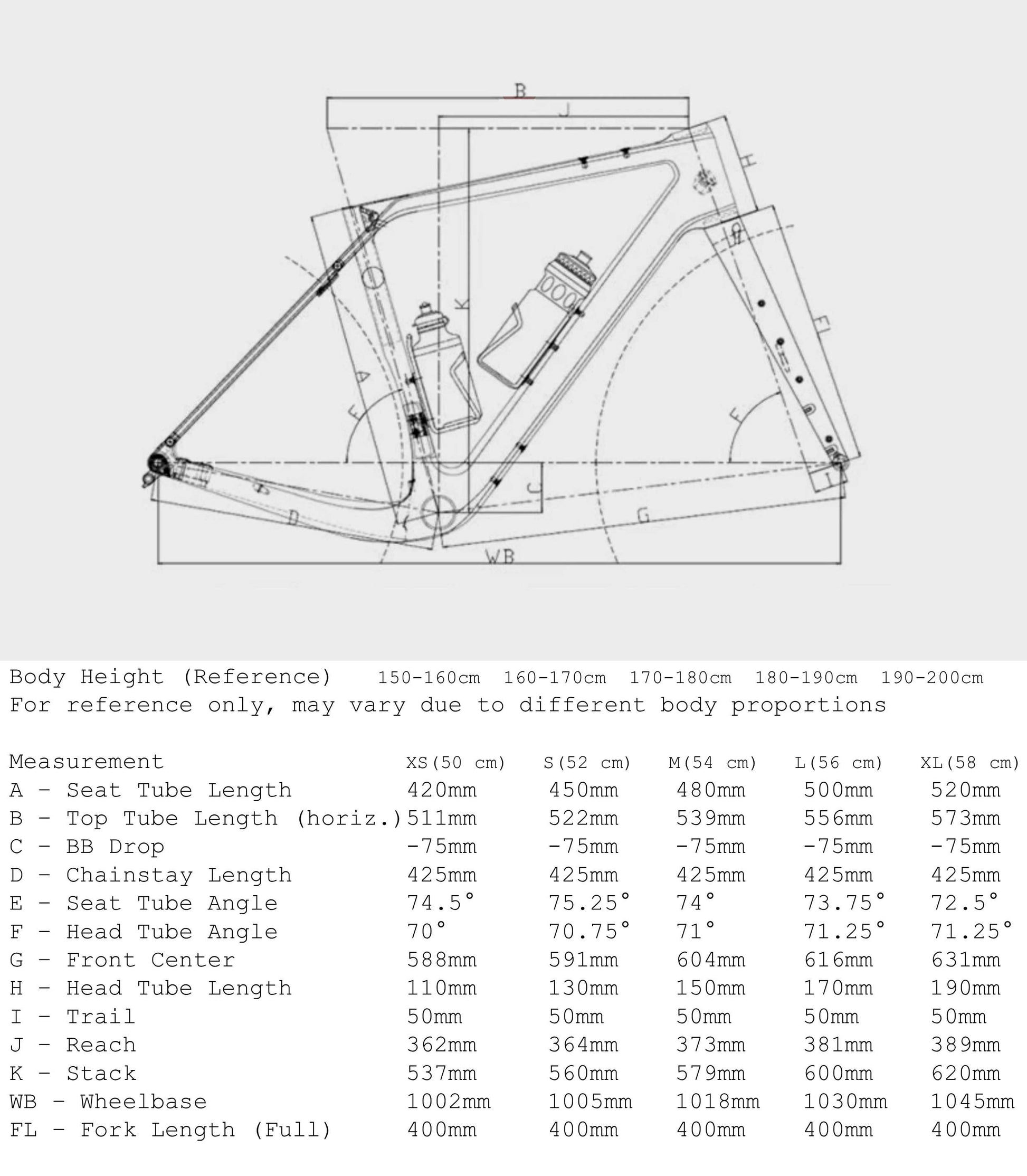 Il telaio e la forcella sono realizzati in carbonio TORAY T800, che garantisce una costruzione leggera ma robusta. La bicicletta è dotata di un manubrio in carbonio RINOS e una serie di sterzo in alluminio per garantire una direzione affidabile e stabile.